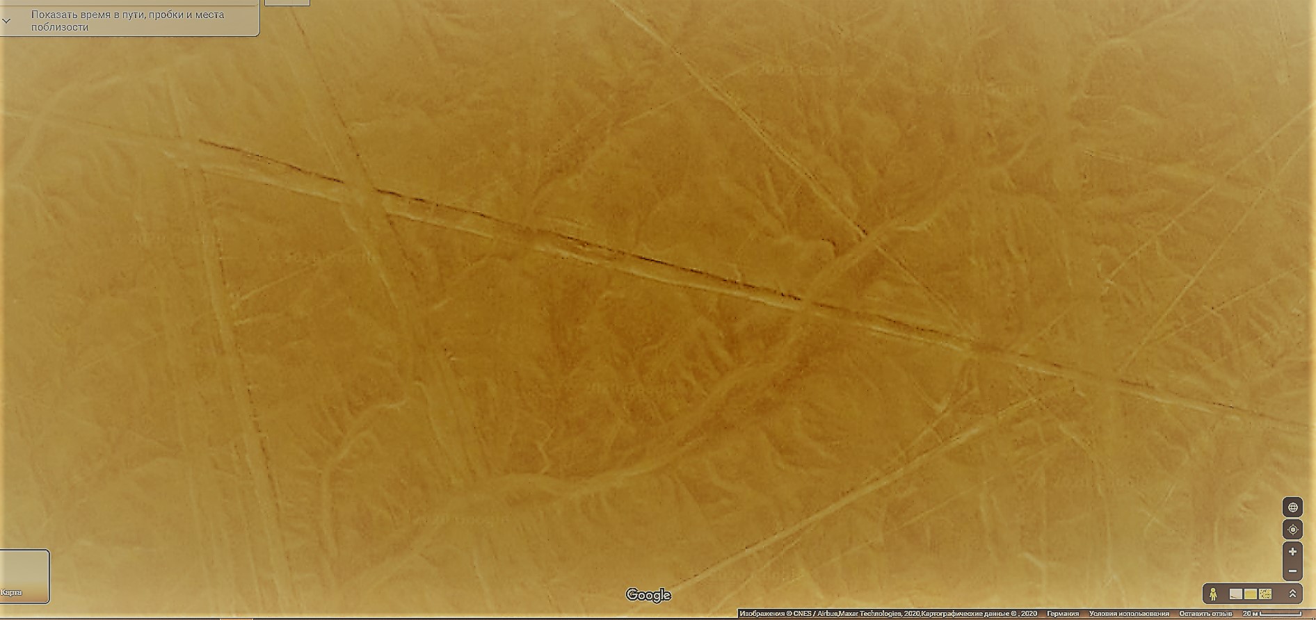 Ну и снова скриншоты с карт,которые нам предоставляет многоуважаемый Google.Ага,вот эти скриншоты с Южной Америки,вроде это Перу,но не уверен,но есть координаты,по которым можно посмотреть местоположения этих мест(вроде как каламбур,но это не важно).В принципе это просто местность,скажем так-довольно пересечённая и пересечена она во многих случаях не без вмешательства кого-то.И получается что эта местность представляет для кого-то какой-то интерес.Ну вот например-кому придёт в голову расчертить символы на земле просто так?Ну вот мы чертили подобные полосы на земле хотя-бы для игры в ножички,но там мы постепенно отрезали чью-то часть земли в свою пользу.А вот здсь кто и какими ножиками расчерчивал?Непонятно это всё,хотя бы потому что в то время когда появились эти образования на земле и наше время,когда мы играли в "землю" очень большой разрыв во времени имеют...Много раз люди брались разгадать,понять и объяснить всем-что это и для чего.Или вот ещё скриншот-очень похоже на развязку